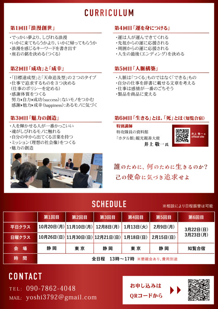 | 第1回目「浪漫創世」 | ・でっかい夢より、しびれる浪漫 ・いかに来てもらうかより、いかに帰ってもらうか ・浪漫を感じるキーワードを書き出す ・座右の銘を決める(つくる) |